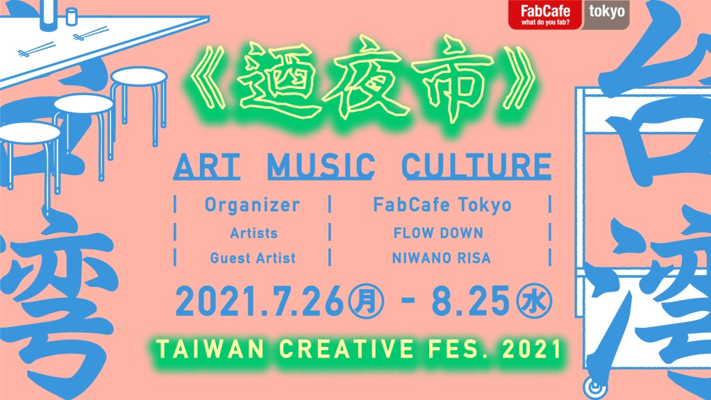 由三位台灣藝術家頌 Song, 迪克 Disk, 北極熊 Philip 共同創立的團體 「FLOW DOWN 浮流道」與旗下攝影師阿本 Heng 將在2021年7月26日起至8月8日於東京澀谷的 FabCafe Tokyo以《迺夜市》 為主題展出近20件為此展特別製作的畫作及攝影作品。所有展出作品皆為原作並開放申請收藏。收購作品將於展覽結束後讓藏家領取。展覽期間店內也會播放由 FLOW DOWN 選出的台灣流行音樂,讓來看展的各位可以感受藝術家們在創作時聽的歌曲(含台語歌)!